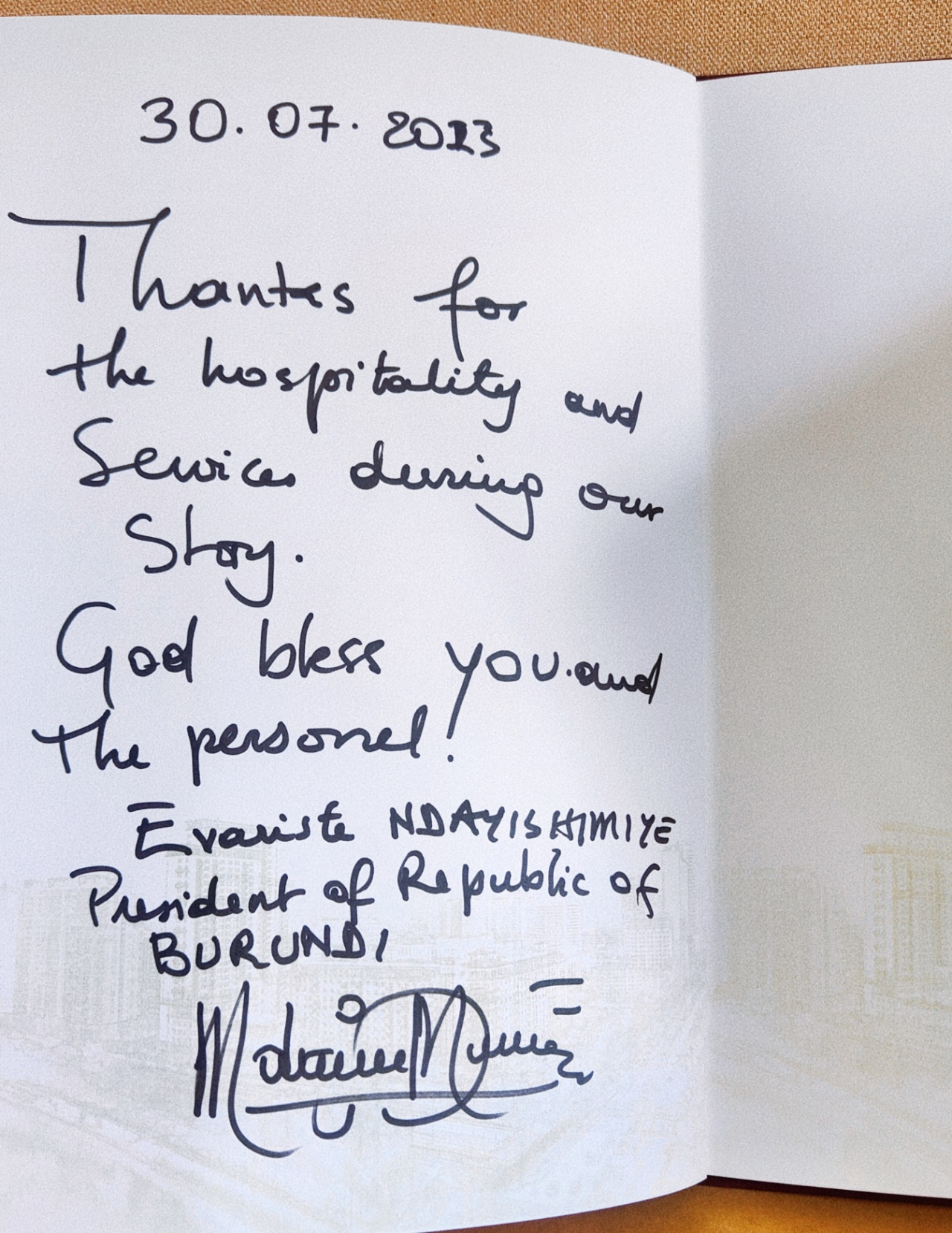 国家向导人及夫人离馆之际 ,在金牛宾馆亲热问候了宾馆以党科同志为代表的服务包管团队成员 ,表达了对川菜的喜欢 ,夸赞川菜“巴适” ,并体现在金牛宾馆可以享用到正宗的川菜 ,赞美金牛宾馆是有古板的宾馆。布隆迪总统恩达伊施米耶在锦江宾馆留言簿上留言 ,体现了对锦江宾馆此次接待的谢谢 ,并与接待职员合影留念。